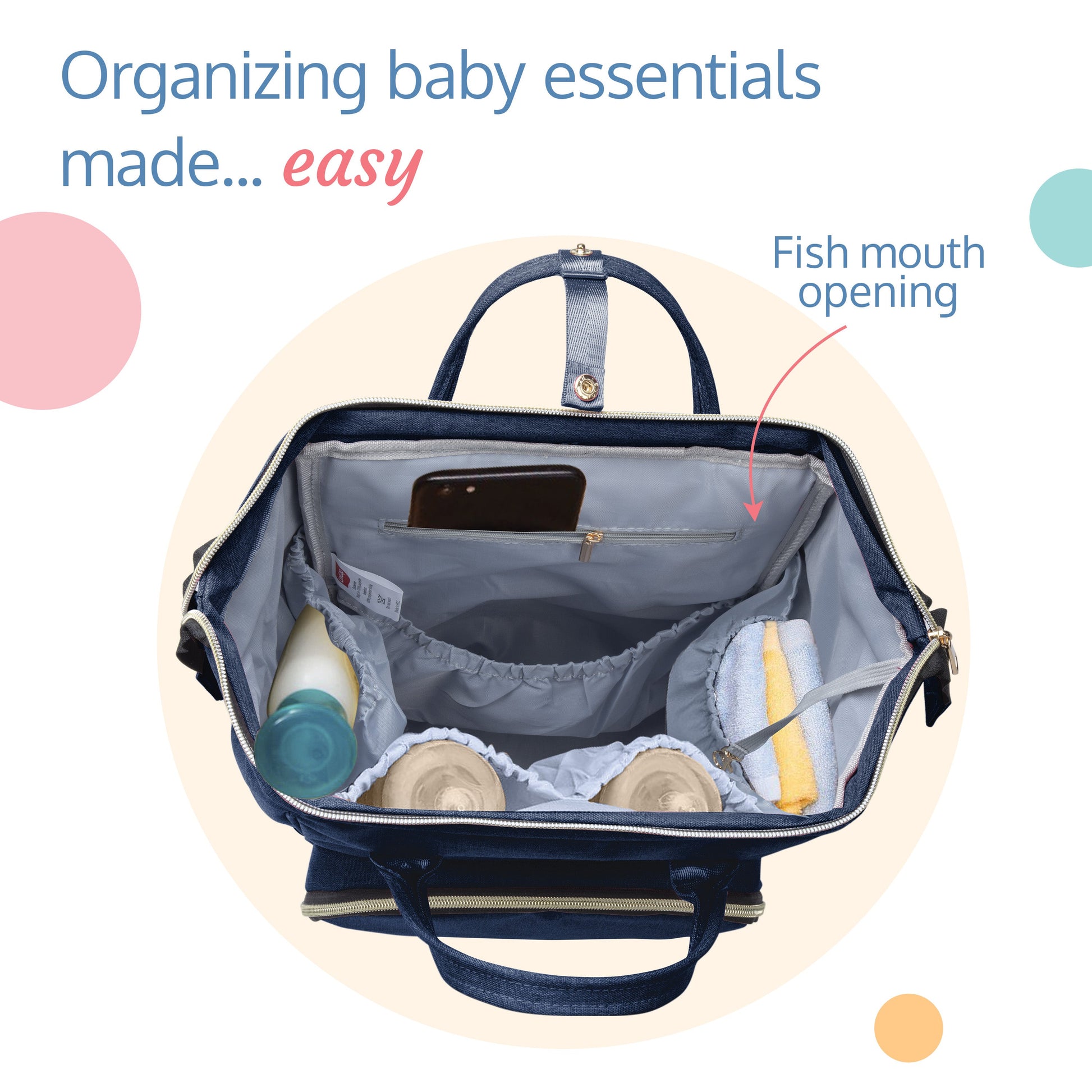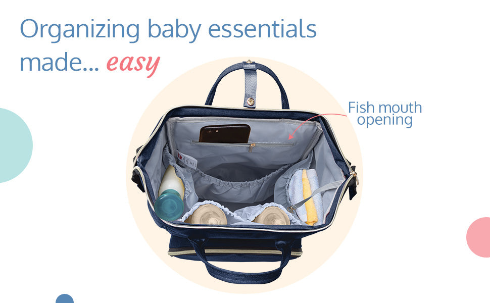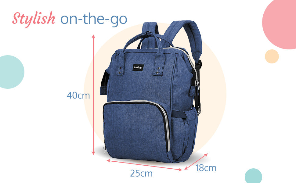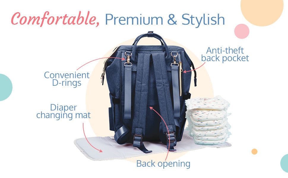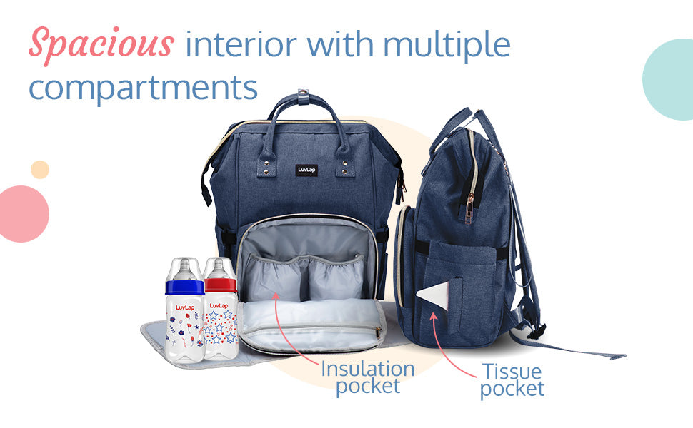 Two way carry - diaper bag can be carried both as a back pack or as a tote bag. Waterproof and easy to clean - made of premium oxford material makes this bag water resistant, thereby safe from water and milk spills. Large storage capacity with 15 pockets - 7 inner pockets with a key ring holder and 8 outer pockets allows organizing items easily, making more space and finding essentials faster. 2 Insulated bottle holders with inner tin foil insulation layer, helps keep milk warm on-the-go, wide view top zipper compartment with metal support allows wide easy viewing to place or take out things easily, hidden anti-theft pocket design at the back and an easy access back pocket makes it convenient and secure. Unique tissue dispensing side pocket allow easy access to tissues during an accidental spill, includes diaper changing mat allowing convenient on-the-go diaper change.