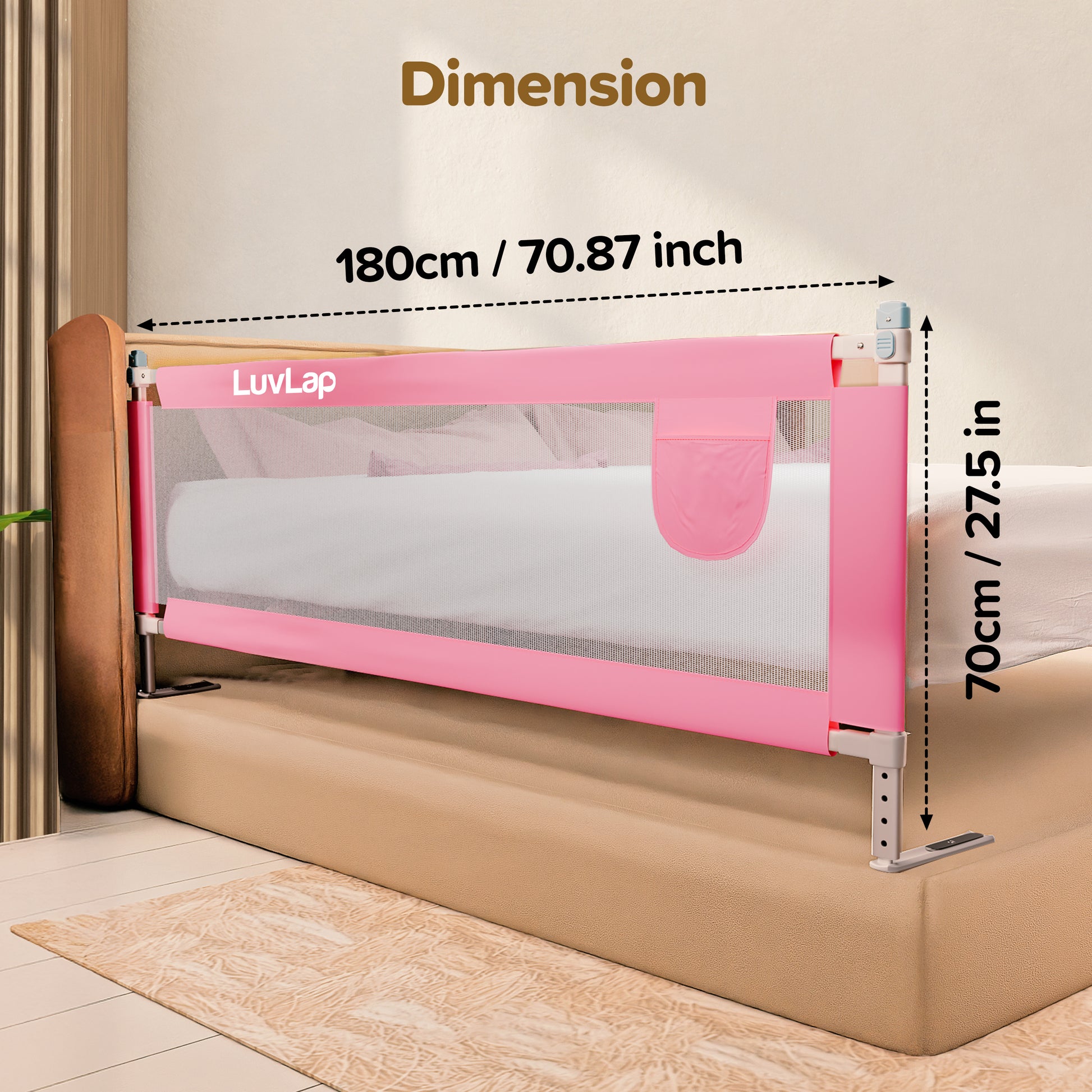 Bed Rail Guard for Baby/Kids Safety, 180cm x 72 cm, Portable & Foldable, Baby Safety Essential, Adjustable Height, fits All Bed Sizes (Pink - Without Print)