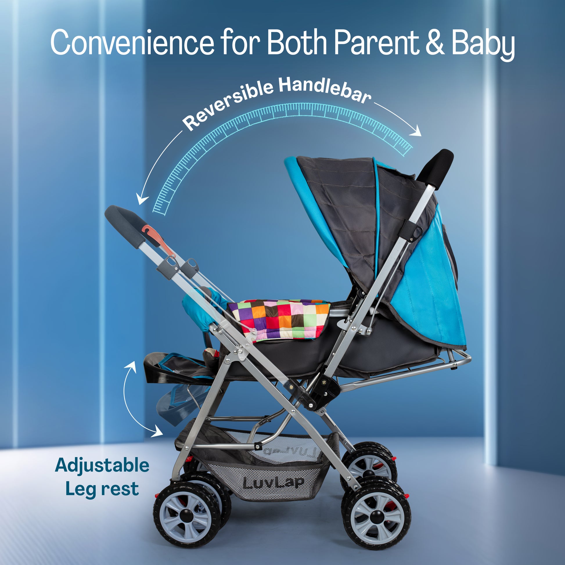 - Comfort Ensured : 3 position Seat recline so that baby can sit, relax or sleep inside the stroller. Cushioned seat, Adjustable footrest & Wheel Suspension adds to baby's comfort. Carrying Capacity up to 8 kgs