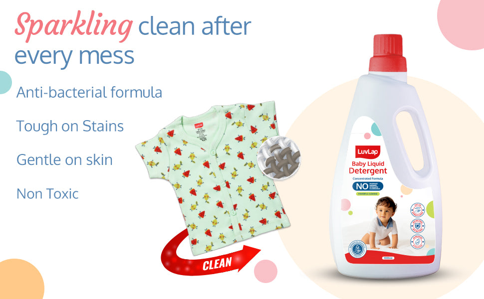 Hello mommies, meet the LuvLap Baby Laundry Detergent. Its anti-bacterial formula is pH balanced & gentle on skin. It loves fighting stains and removes milk odour. Better hygiene is the secret for happy, healthy babies