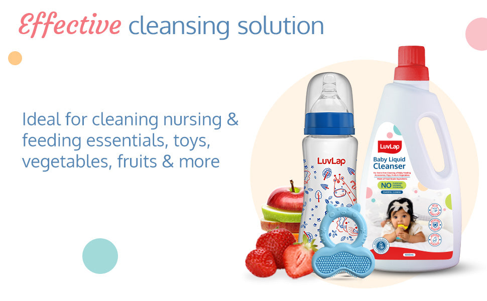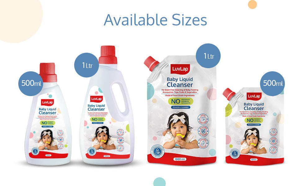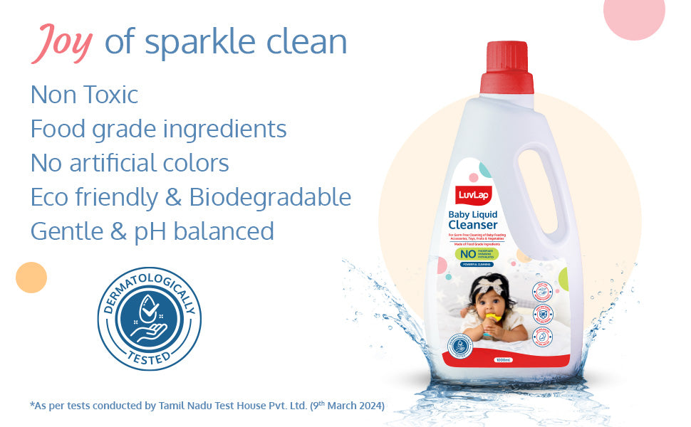 Hello mommies, meet the LuvLap Liquid Cleanser. It is non-toxic food-grade ingredient based formula is tough on stains, kills bacteria & keeps baby items clean. It is dermatologically tested and ensures best hygiene for babies. Better hygiene is the secret for happy, healthy babies.