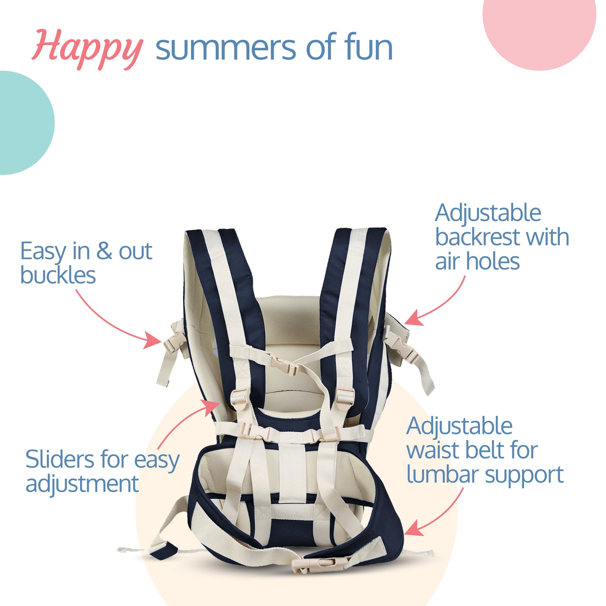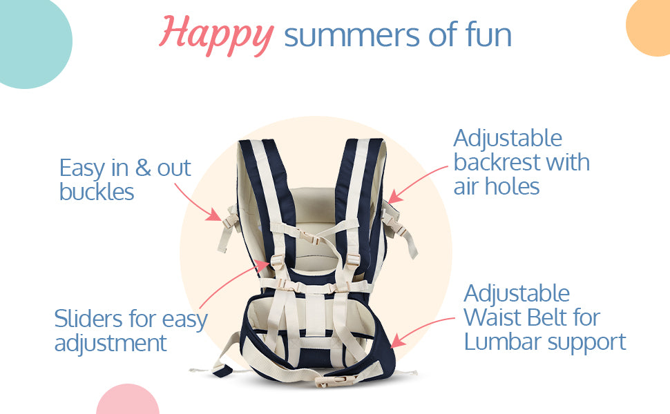 - Adjustable side opening buckles and cushioned leg holes ensure safety and comfort. Front storage pocket on waist belt to store pacifier or other essentials