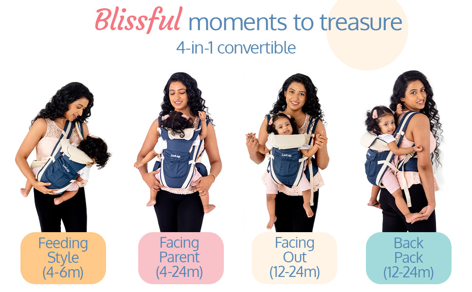 - This baby carrier can be used in 4 carrying positions – Feeding style, Front carry facing parent, Front carry facing out & Back carry options provide ergonomic positions for comfortable carrying