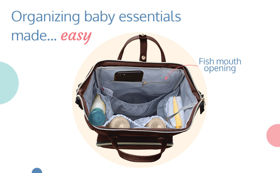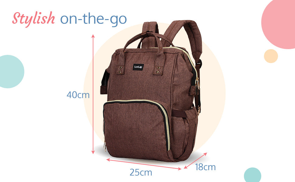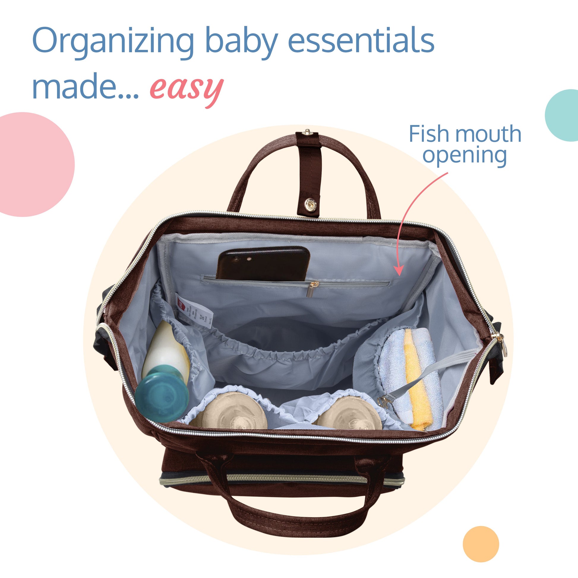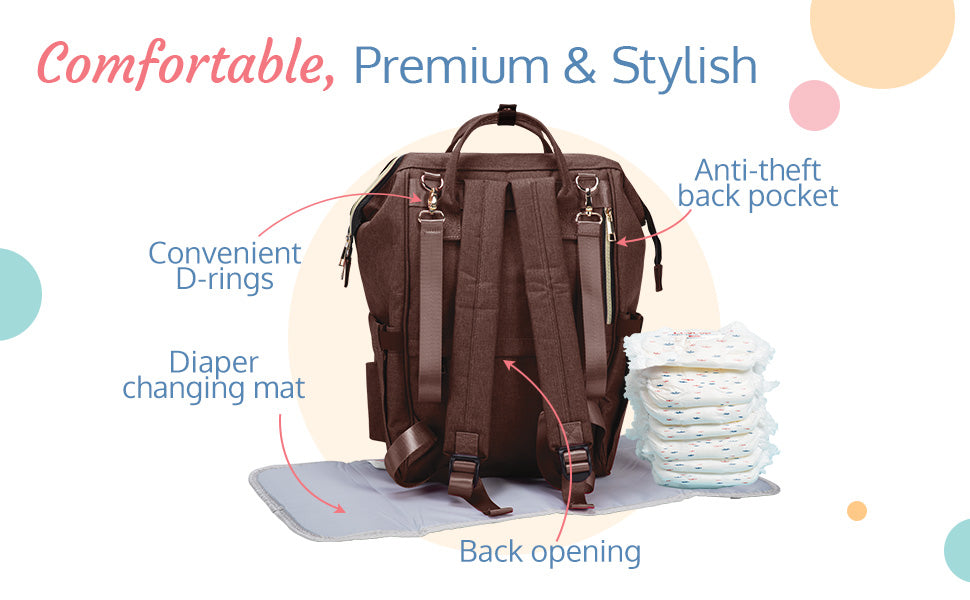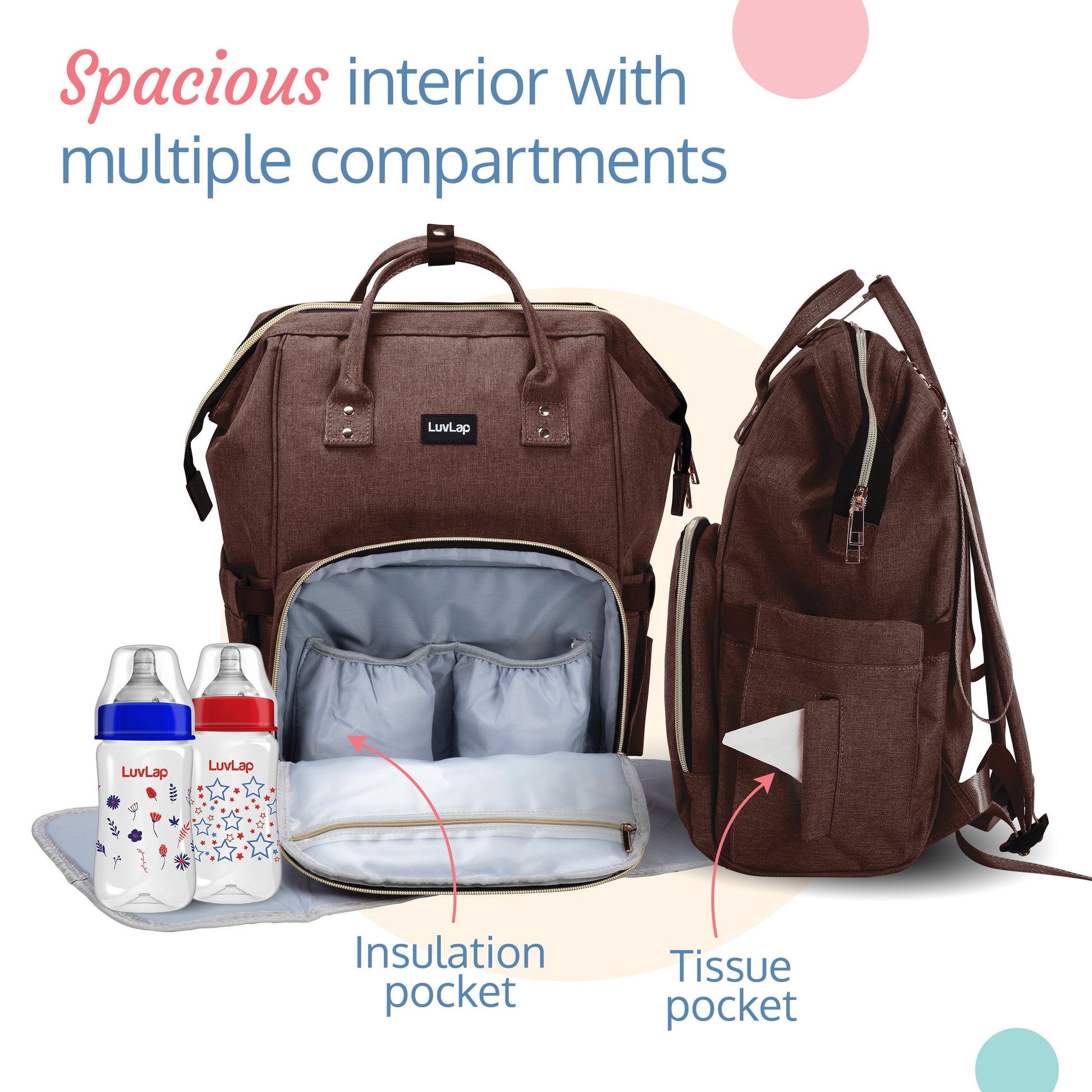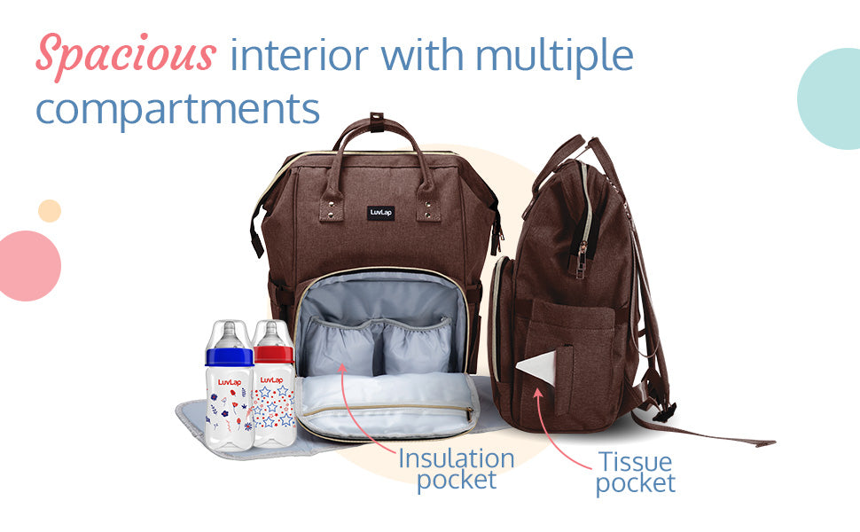 Two way carry - diaper bag can be carried both as a back pack or as a tote bag. Waterproof and easy to clean - made of premium oxford material makes this bag water resistant, thereby safe from water and milk spills. Large storage capacity with 15 pockets - 7 inner pockets with a key ring holder and 8 outer pockets allows organizing items easily, making more space and finding essentials faster. 2 Insulated bottle holders with inner tin foil insulation layer, helps keep milk warm on-the-go, wide view top zipper compartment with metal support allows wide easy viewing to place or take out things easily, hidden anti-theft pocket design at the back and an easy access back pocket makes it convenient and secure. Unique tissue dispensing side pocket allow easy access to tissues during an accidental spill, includes diaper changing mat allowing convenient on-the-go diaper change.