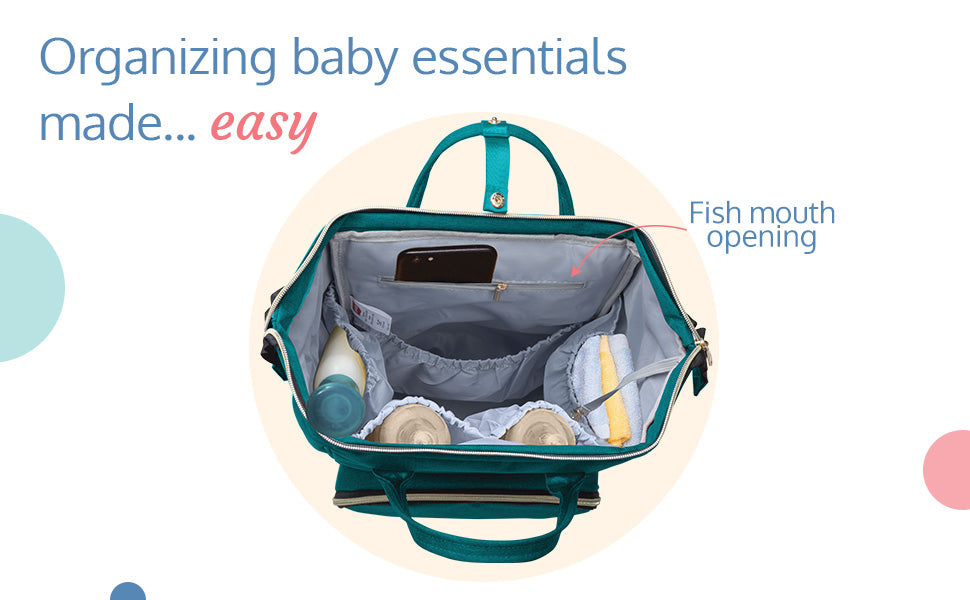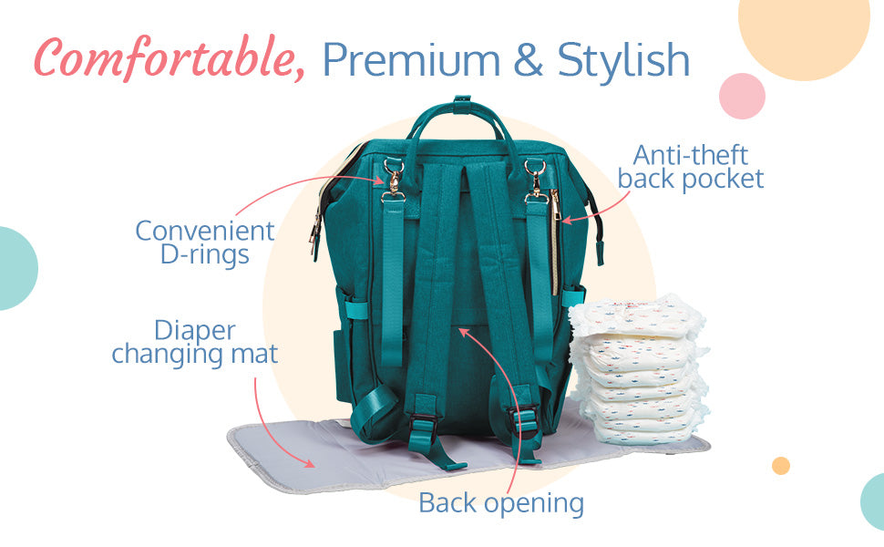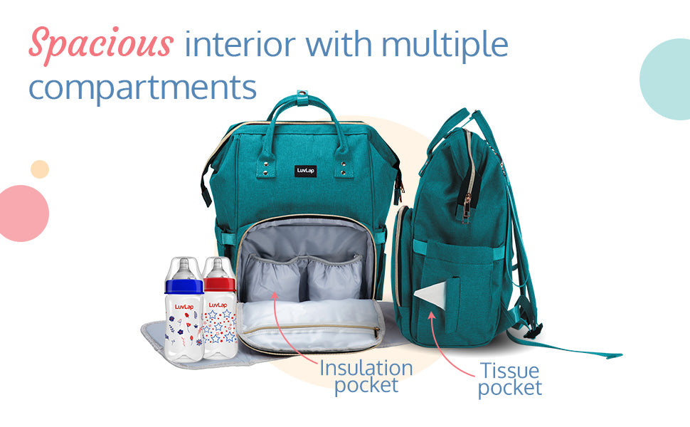 Two way carry-diaper bag can be carried both as a back pack or as a tote bag.Waterproof and easy to clean-made of premium oxford material makes this bag water resistant,thereby safe from water and milk spills. Large storage capacity with 15 pockets-7 inner pockets witha key ring holder and 8 outer pockets allows organizing items easily, making more space and findingessentials faster. 2 Insulated bottle holders with inner tin foil insulation layer, helps keep milk warmon-the-go, wide view top zipper compartment with metal support allows wide easy viewing to placeor take out things easily, hidden anti-theft pocket design at the back and an easy access back pocketmakes it convenient and secure. Unique tissue dispensing side pocket allow easy access to tissuesduring an accidental spill, includes diaper changing mat allowing convenient on-the-go diaperchange.