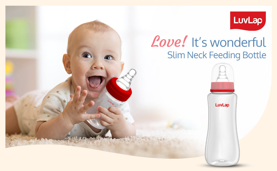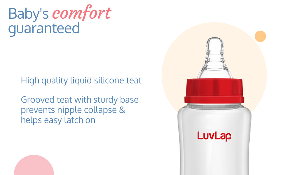 LuvLap Essential Feeding Bottles are ergonomically designed to be easily held while feeding the baby. All LuvLap bottles are 100% BPA free and fully sterilizable. The teats are 100% Liquid Silicone and have an anti-colic valve that vents air into the bottle, preventing any air from entering the baby's tummy. The teat has spiral grooves at the tip, which encourage peristaltic suckling, and help the baby get a comfortable latch. The grooved teats and superior silicone quality ensure no nipple collapse, helping in an uninterrupted feed. With the LuvLap Essential Feeding Bottles at your side, your baby's feed will always be a comfortable one
