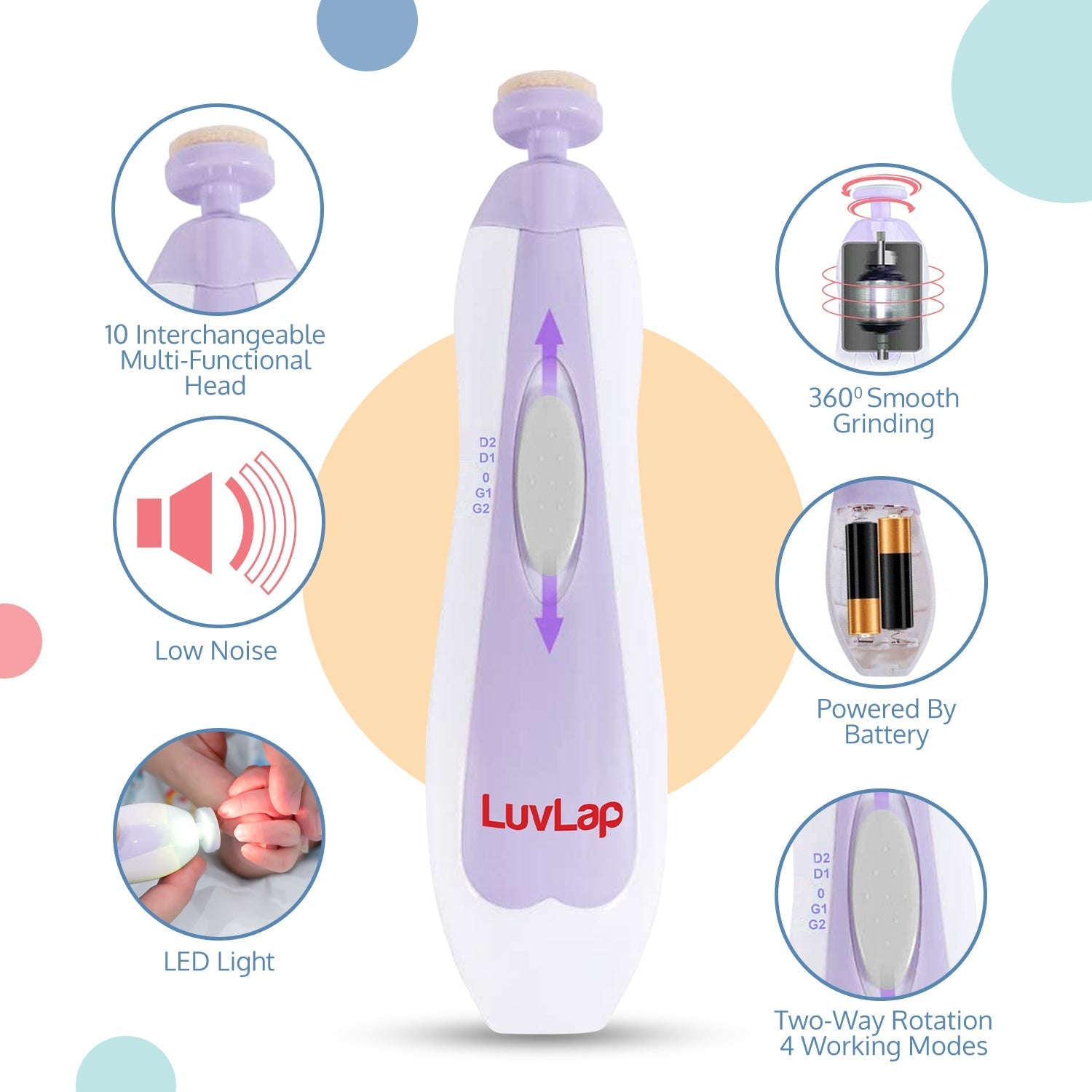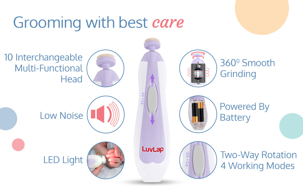 - Comes with 10 different filing / grinding heads suitable for filing, shaping, buffing, and manicuring. 8 EXTRA replacement file pads are required at different stages of the baby’s growth & various needs. No need for replacement sandpaper/filer