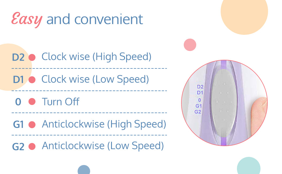 - Multiple Setting – Multi-level speed control (4 Levels) for enhancing nail filing positions and softer, smoother nails without hurting fingertips