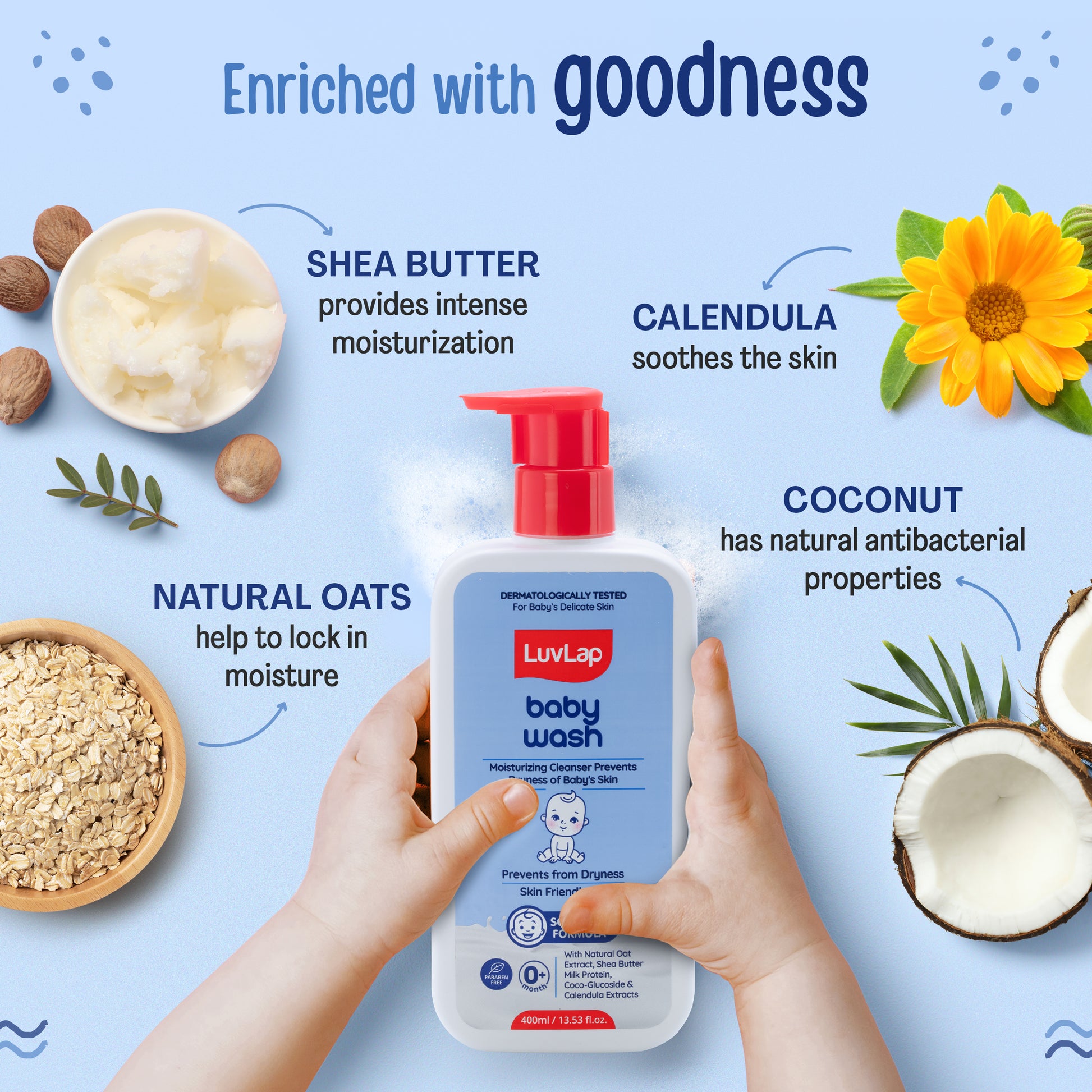LuvLap Baby Wash - 400ml, with Milk Protein, Oatmeal, Shea Butter and Vitamin E, Soap Free, Baby Wash for Baby Bath, Natural, pH Balanced & Paraben Free, Dermatologically Tested