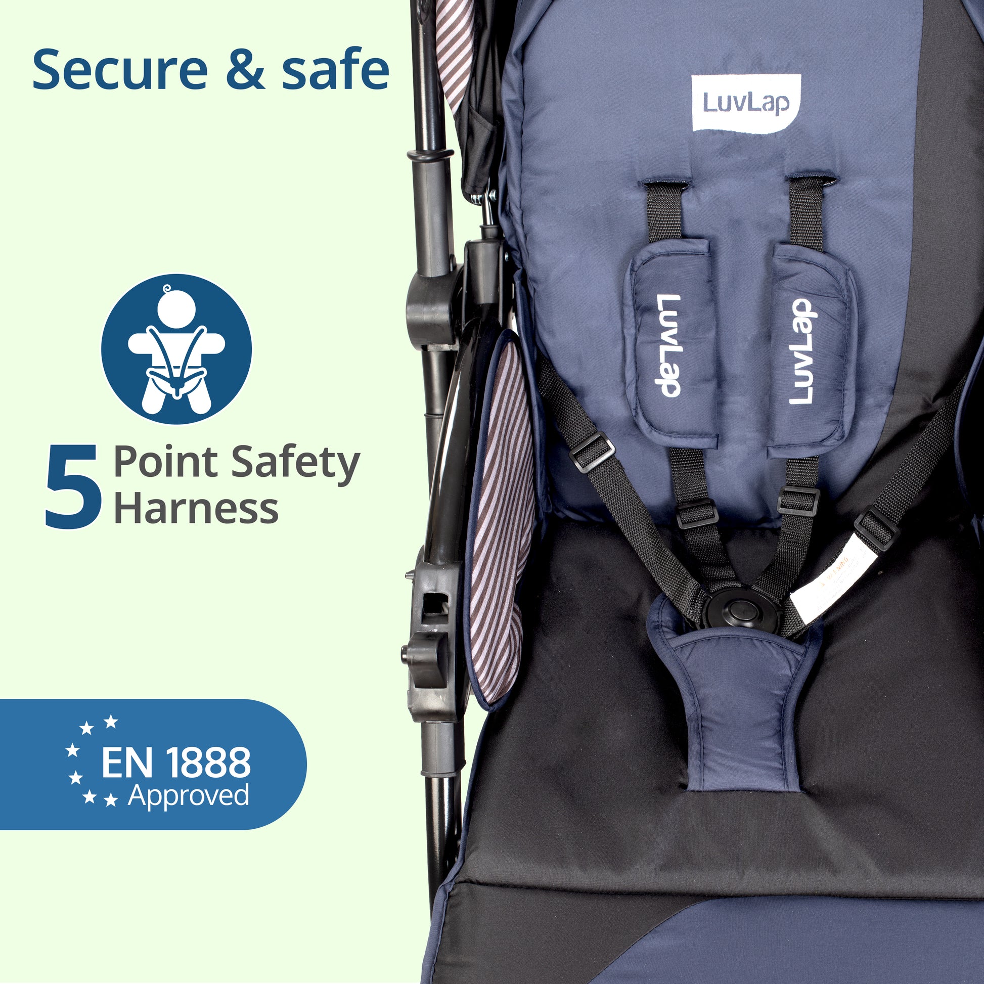 - Certified as per European Standard EN 1888. It has 5 point safety harness for child safety and Easy One Hand Fold