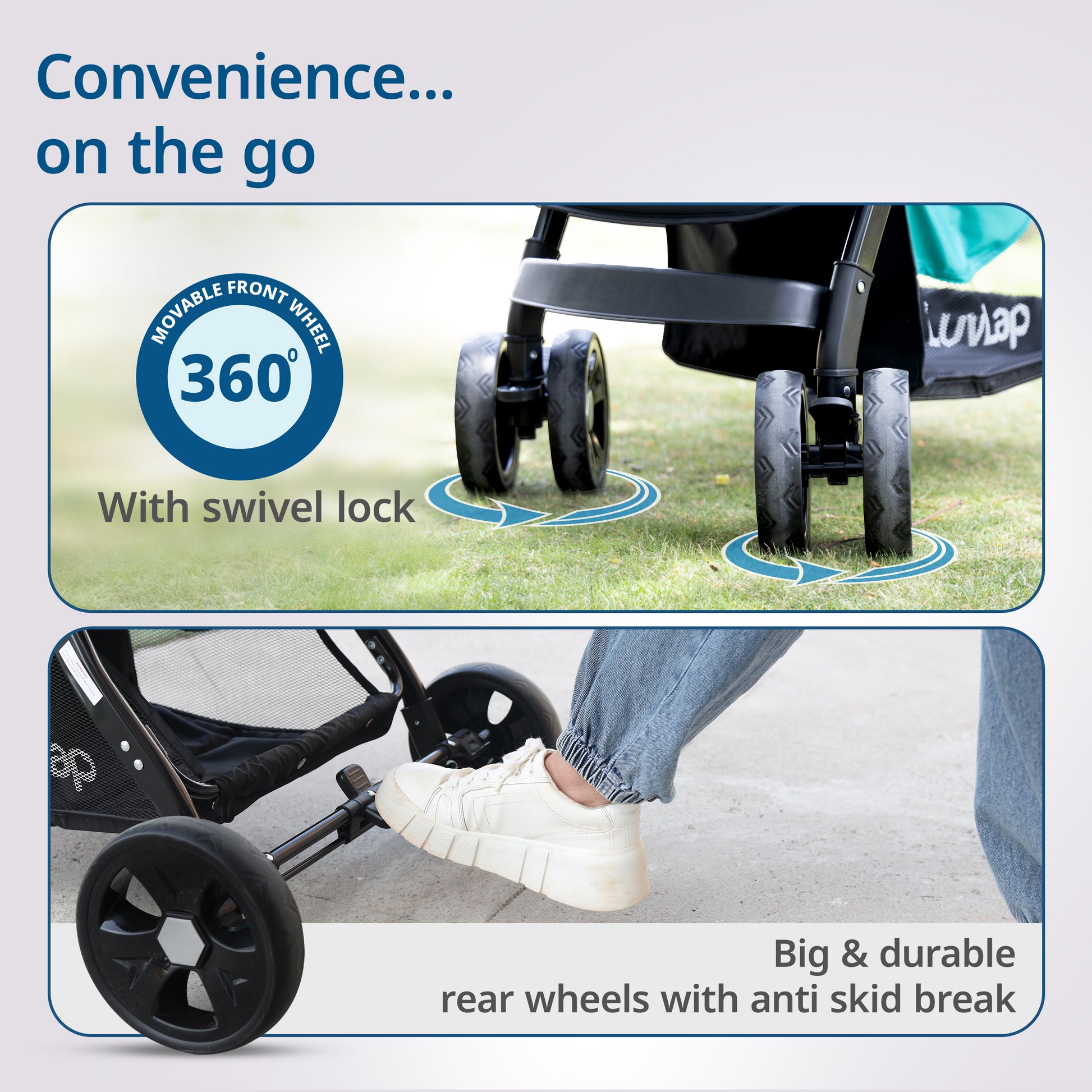 - Spacious stroller with heavy duty wheels - Best choice for outdoor use. Comes with Reversible handle bar that helps mom stroll facing baby.