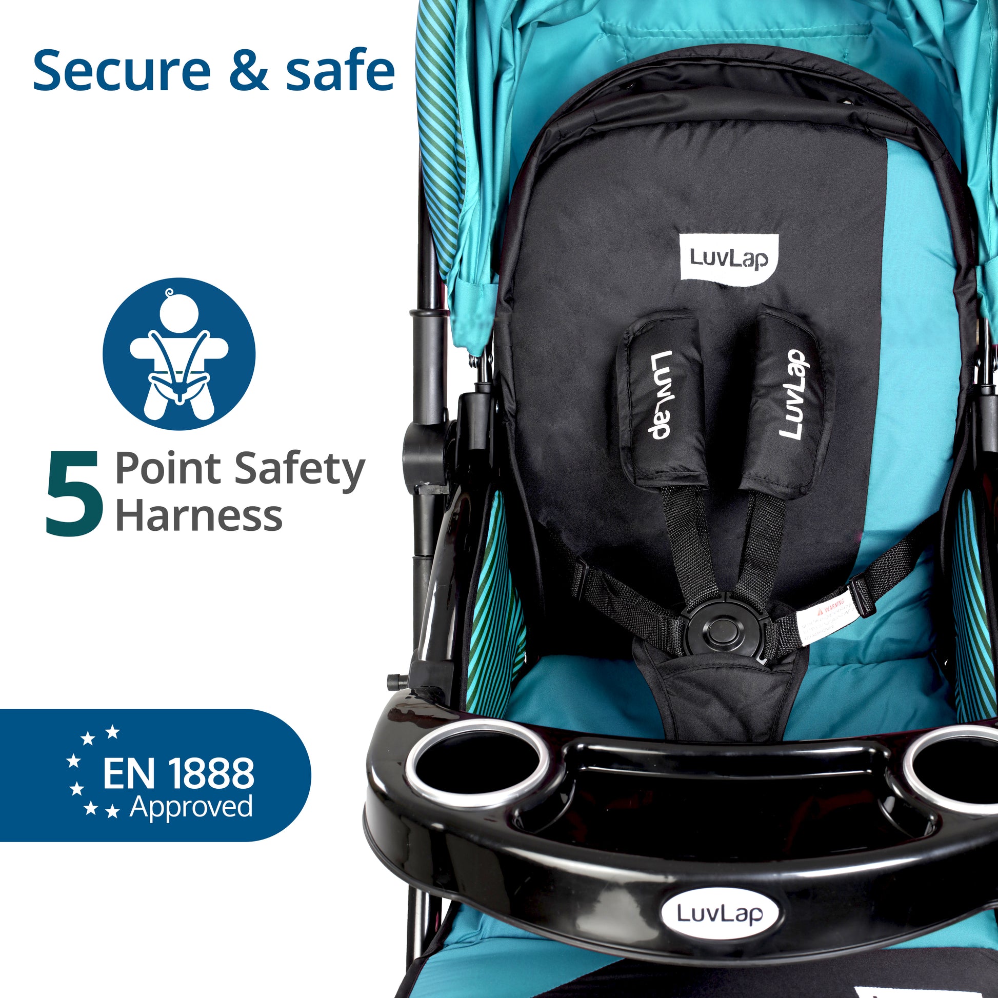 - Certified as per European Standard EN 1888. It has 5 point safety harness for child safety and Easy One Hand Fold