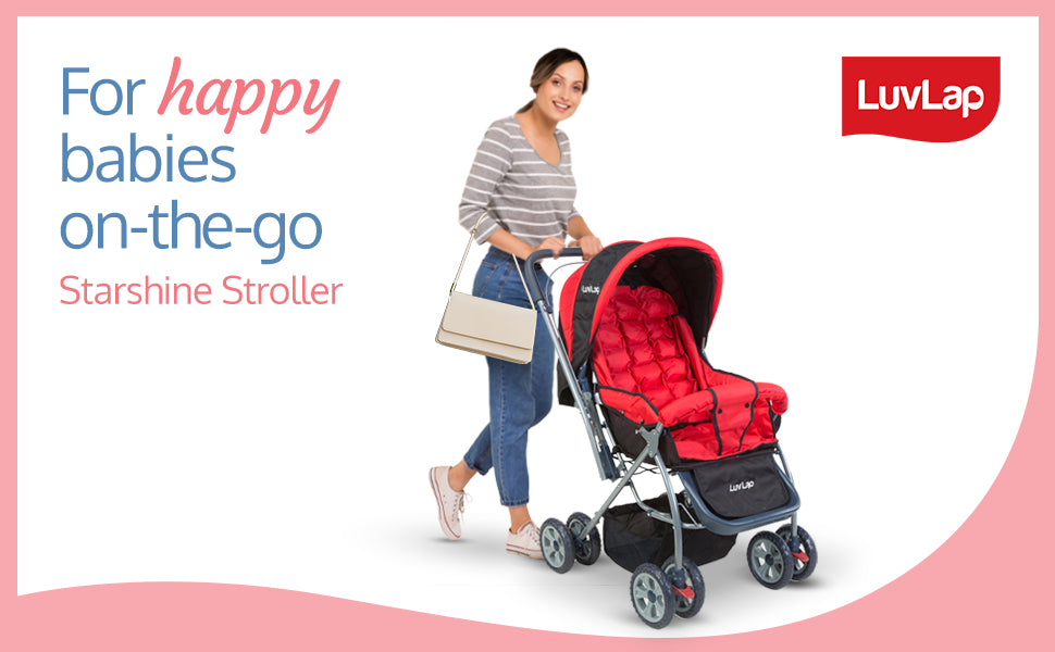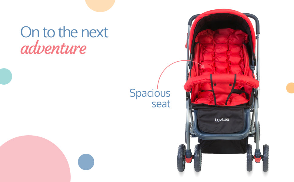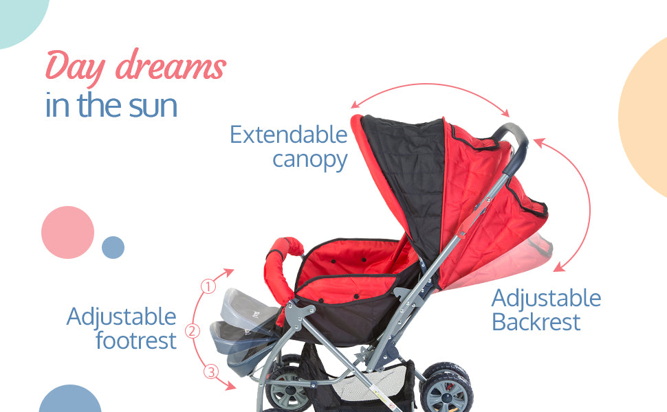 - Comfort Ensured : 3 position Seat recline so that baby can sit, relax or sleep inside the stroller. Cushioned seat & Adjustable footrest adds to baby's comfort. Double layred canopy saves the baby from harsh sunlight.