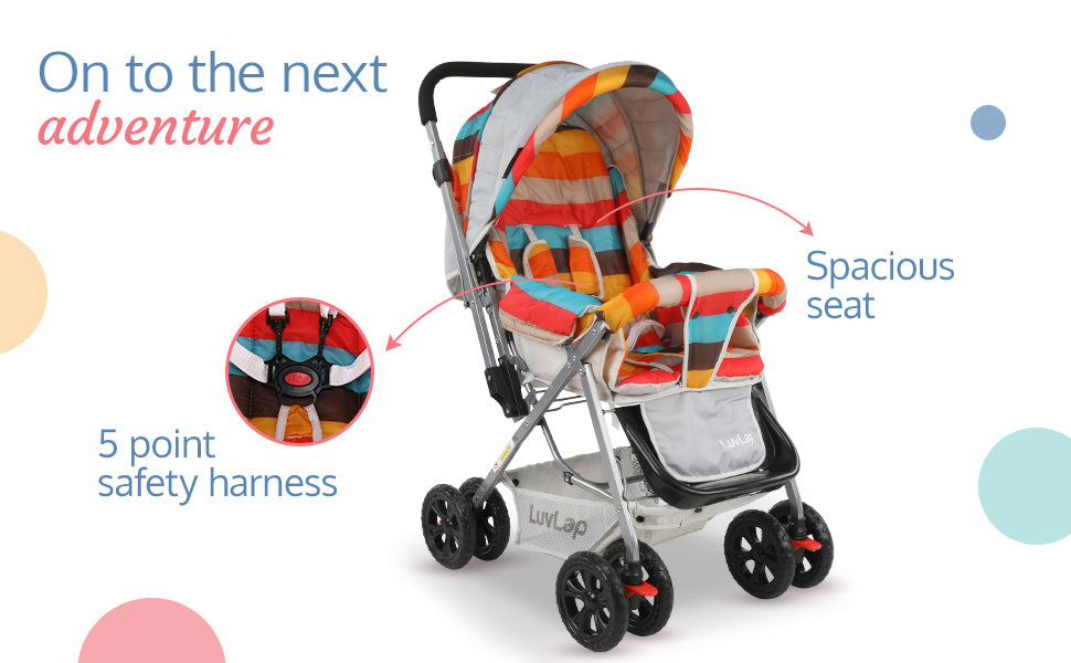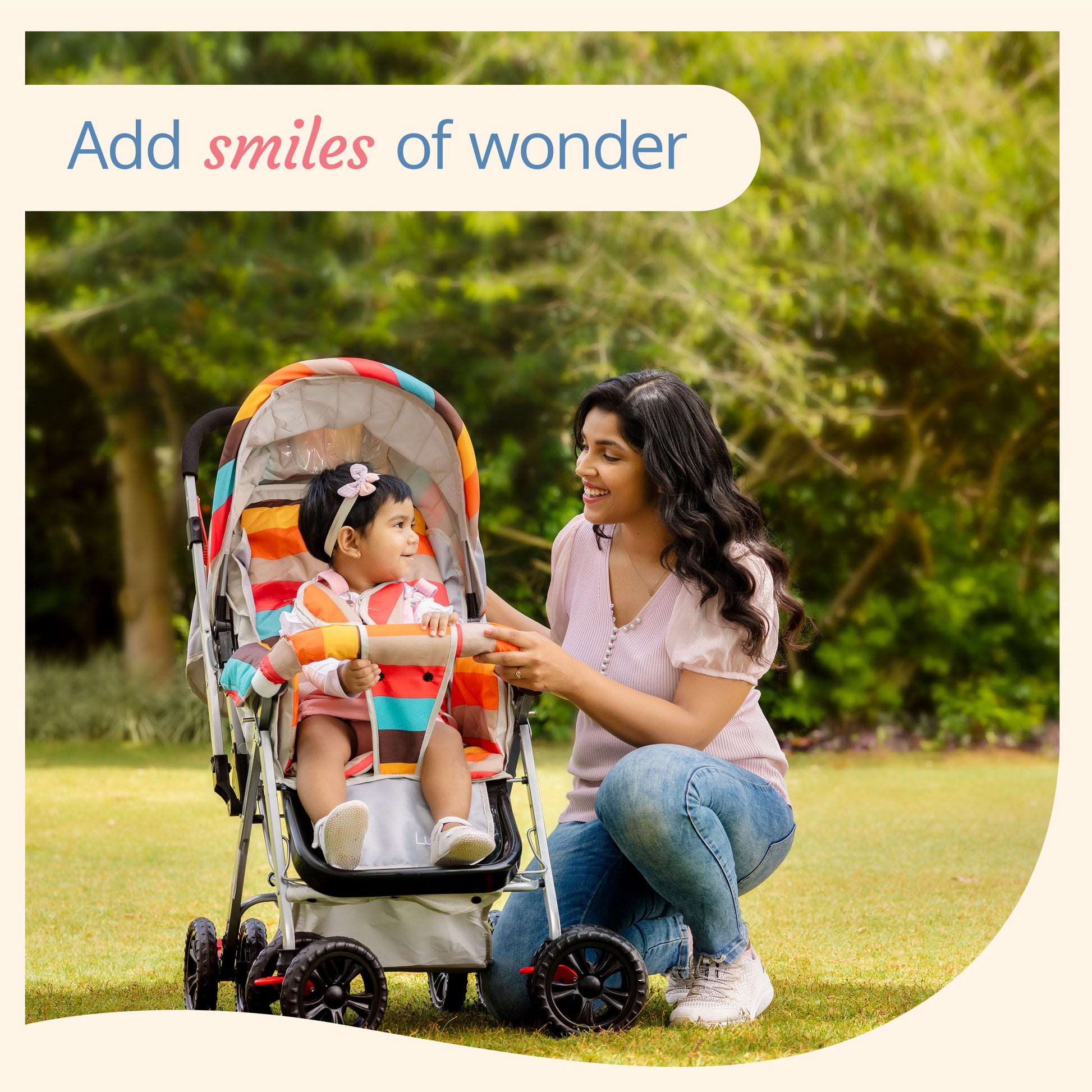 - High on Safety : 5 point safety harness to secure your child safely in the stroller, Wheels with brakes ensure safe strolling experince
