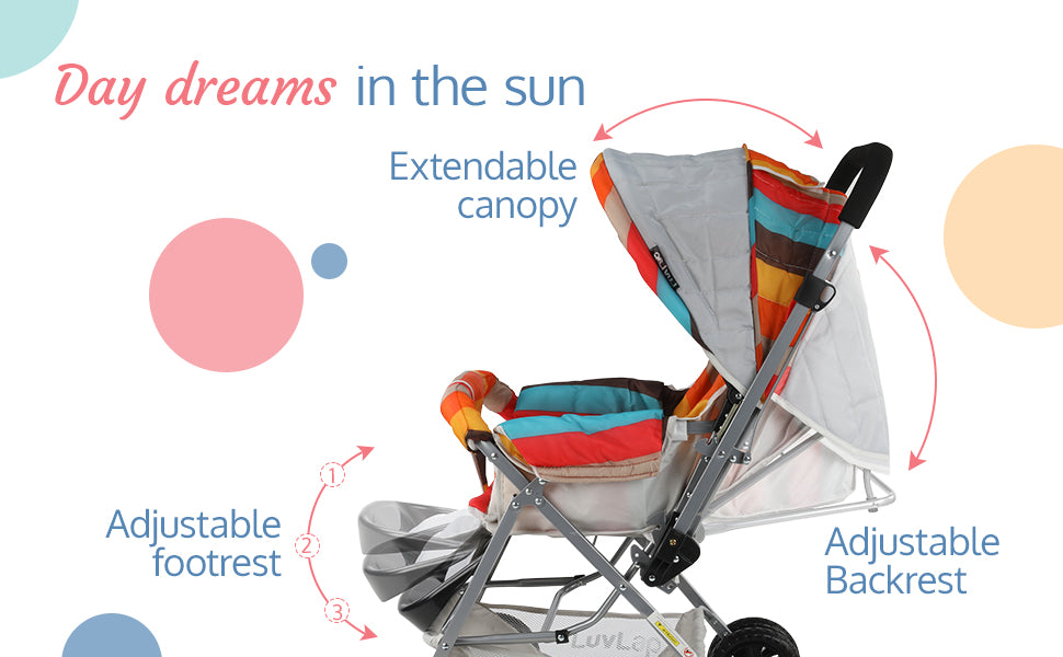We had seen many baby stroller in the market but not convinced with any as some were costly and some looked very delicate, we wanted one which is cost effective and also sturdy enough for Indian roads (meaning where we have potholes and other mud roads). Baby stroller from Luvlap is good to use, have lot of features and storage places, mainly the wheels are big and sturdy as we can use it roughly on any roads. We have got a rainbow baby stroller and sure its an eye catchy as everyone on the road looks in to them. we would really recommend this baby stroller for all where you get a quality product for the best price.
