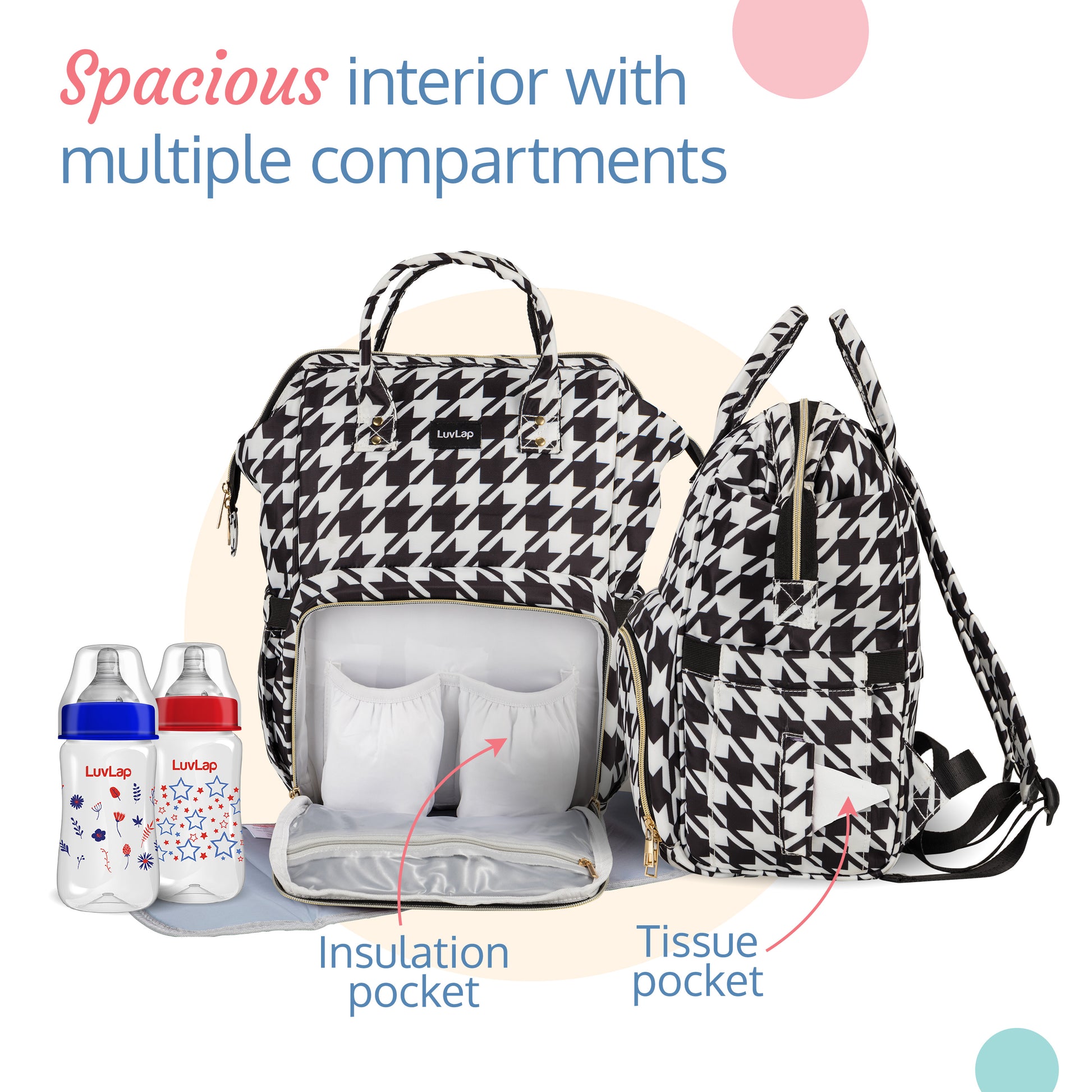 Two way carry-diaper bag can be carried both as a back pack or as a tote bag. Waterproof and easy to clean-made of premium oxford material makes this bag water resistant, thereby safe from water and milk spills. Large storage capacity with 15 pockets-7 inner pockets with a key ring holder and 8 outer pockets allows organizing items easily, making more space and finding essentials faster. 2 Insulated bottle holders with inner tin foil insulation layer, helps keep milk warm on-the-go, wide view top zipper compartment with metal support allows wide easy viewing to place or take out things easily, hidden anti-theft pocket design at the back and an easy access back pocket makes it convenient and secure. Unique tissue dispensing side pocket allow easy access to tissues during an accidental spill, includes diaper changing mat allowing convenient on-the-go diaper change.