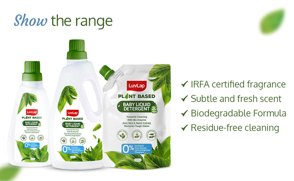Presenting your go-to baby's laundry solution: LuvLap Plant-Based Baby Detergent! This liquid baby detergent is an amazing color-retaining agent in addition to being strong on stains and smells. Rich in neem and Aloe Vera, it envelops your baby's skin in the goodness of nature. With our liquid baby laundry detergent, bid your anxieties farewell. This liquid detergent is perfect for washing baby items because it is mild but powerful. Get the greatest baby care products right now to keep your kid's outfit colorful and trendy!