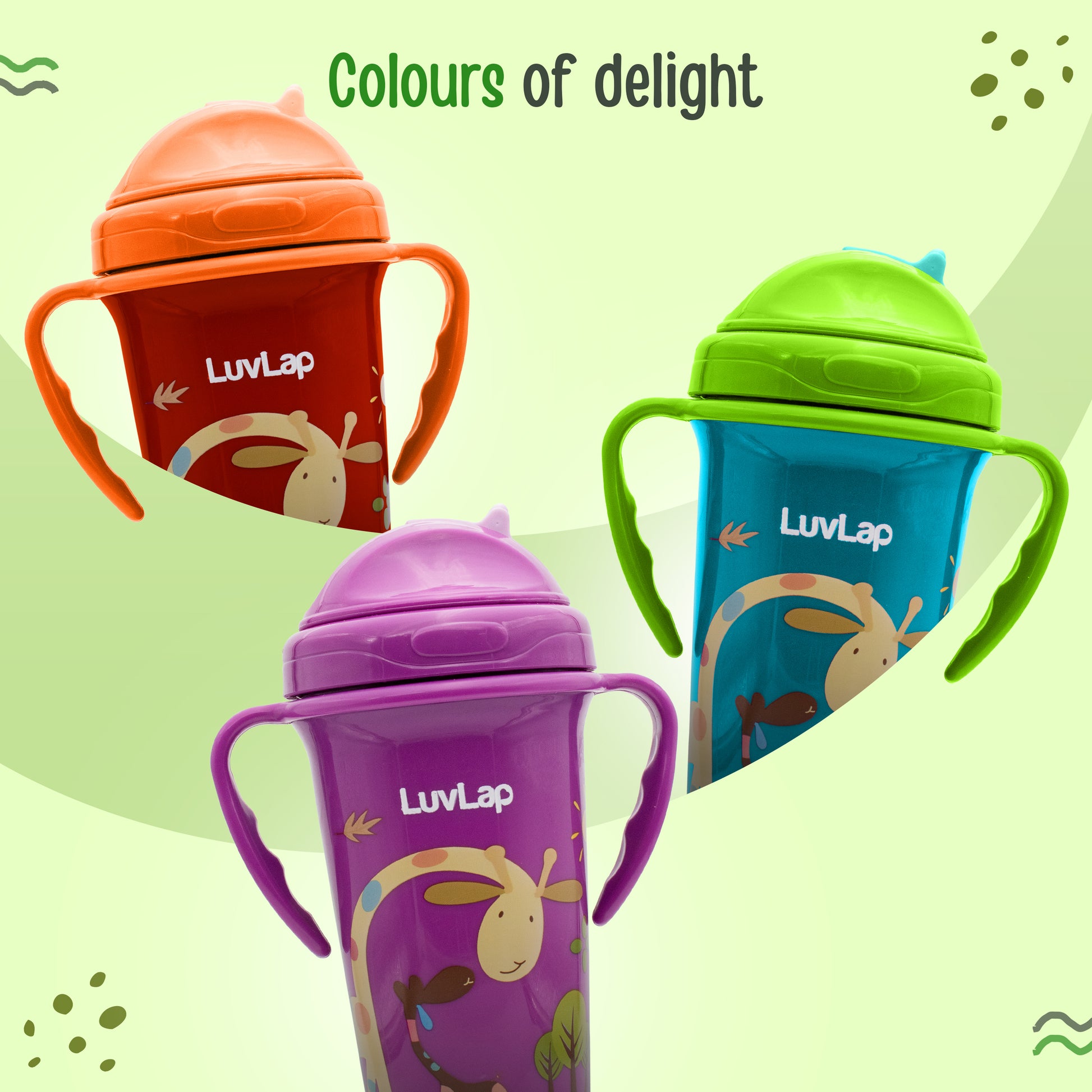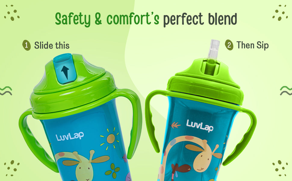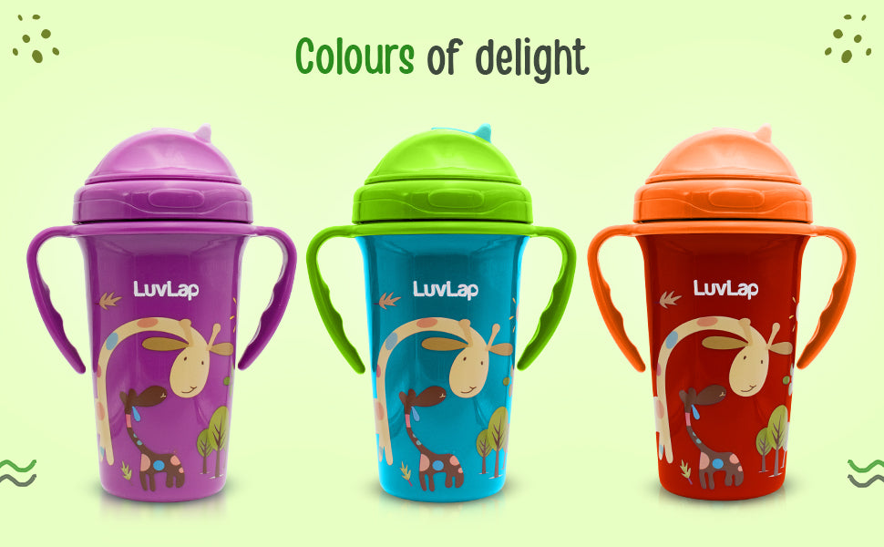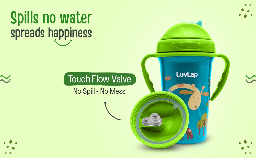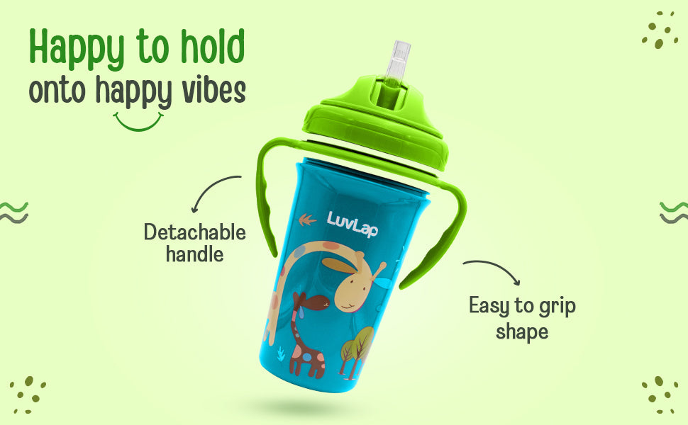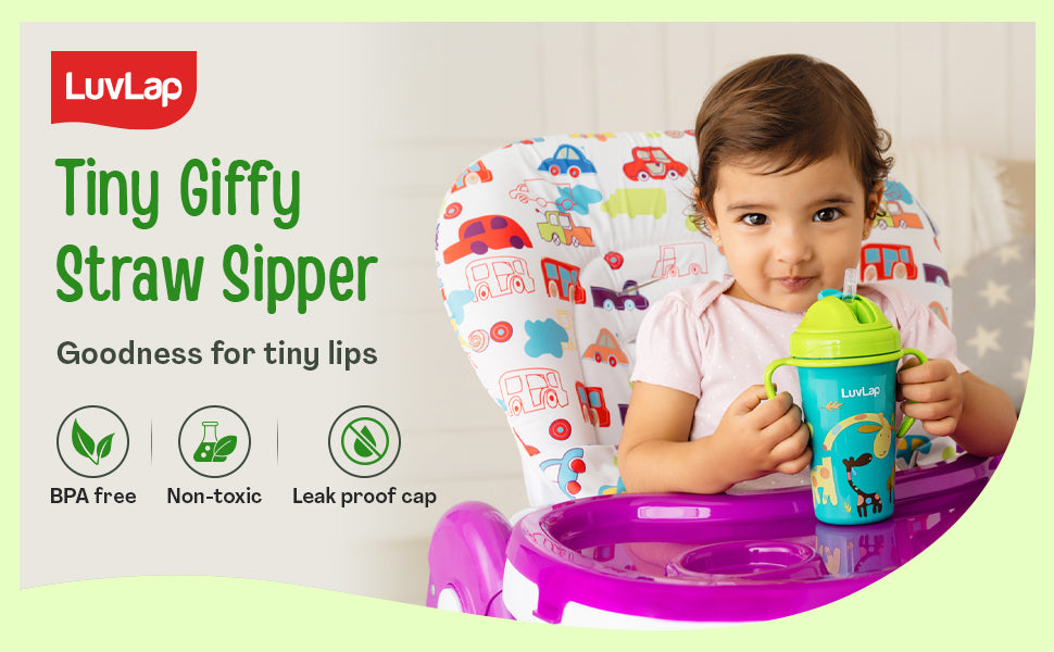 LuvLap Tiny Giffy Sipper helps through baby's transition stages to drink independently. It comes with a soft silicone straw which supports dental health. The handles are also designed as per baby's little hands and are detachable as well to suit the baby's preference and needs. Built in touch-flow valve allows baby led drinking and helps avoid any spills or mess. All parts are sterilizer safe and BPA free